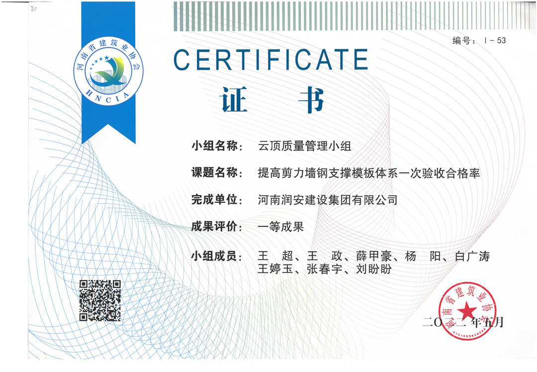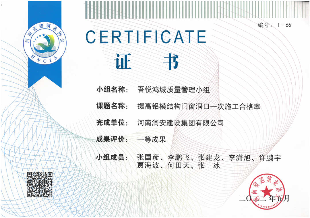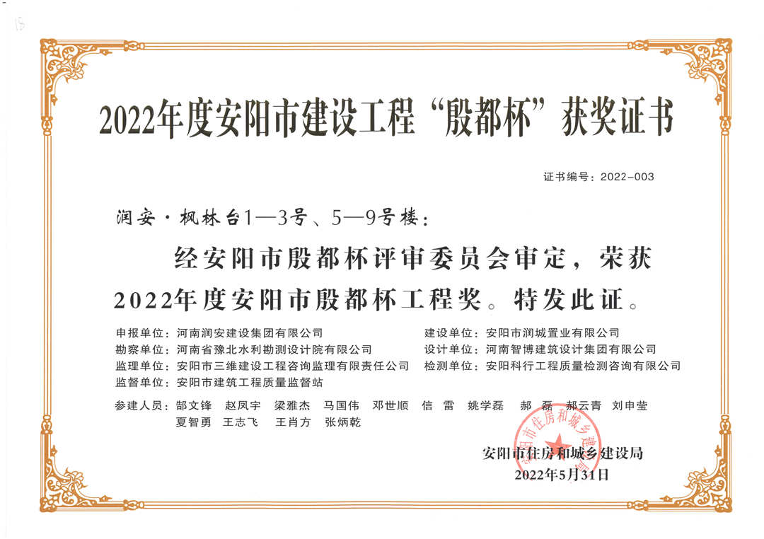 近期,集團公司承建的多個項目捷報頻傳,先后有“林州碧桂園?林語印象項目”,被評為2022年上半年安陽市建筑工程質(zhì)量標準化示范工地;潤安楓林臺1-3、5-9號樓、林州碧桂園?天璽7號樓榮獲2022年度安陽市殷都杯工程獎。同時,吾悅鴻城質(zhì)量管理小組、云頂質(zhì)量管理小組、璽悅質(zhì)量管理小組申報的三項課題均被河南省建筑業(yè)協(xié)會評為一等成果。